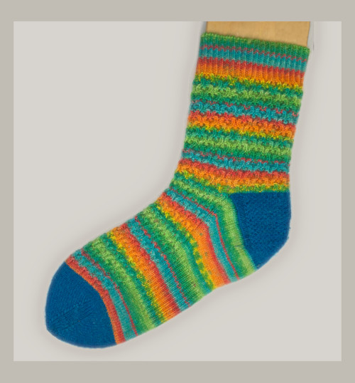 Join contrast yarn. Heel flap = 3 stitches garter stitch on either side, and work heel in Eye of Partridge until 22 ridges of garter stitch are done. (20 ridges for a regular height instep)